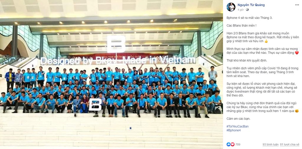 Trước đó, vào đầu tháng 2, chia sẻ trong Group Bphone, CEO Bkav Nguyễn Tử Quảng cho biết, theo dự kiến Bphone 4 ra mắt vào tháng 3/2020. Nhưng trước dịch bệnh virus Covid-19, ông Quảng đang trưng cầu ý kiến các thành viên về khả năng lùi lại lịch ra mắt hoặc tổ chức với quy mô nhỏ hơn, thay vì sự kiện lớn như 3 đời Bphone trước. Chỉ 4 phút sau bài chia sẻ, đã có 150 người cho rằng vẫn nên ra mắt như kế hoạch nhưng chỉ tổ chức sự kiện ở quy mô vừa phải, tránh tụ tập nhiều người; 85 người khẳng định nên lùi thời gian ra mắt, chờ hết dịch bệnh; 9 người nói rằng vẫn ra mắt theo đúng kế hoạch.