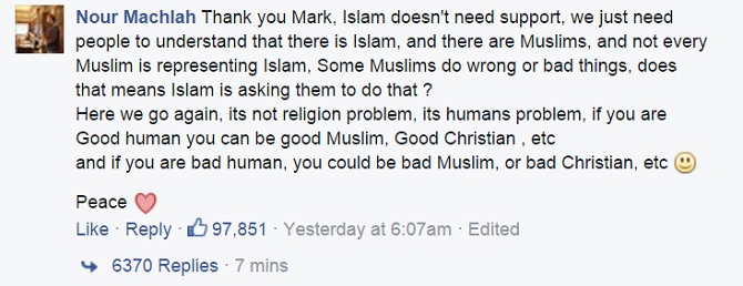 Lời bình luận nhận được nhiều lượt thích và phản hồi nhất cho bài viết trên của Mark. Tài khoản Nour Machlah muốn gửi đi thông điệp rằng: "Chúng tôi chỉ cần mọi người hiểu rằng, không phải tất cả những người Hồi giáo đều đại diện cho đạo Hồi. Một số người Hồi giáo làm điều gì đó sai lầm hoặc xấu xa, phải chăng điều đó có nghĩa rằng đạo Hồi bắt họ phải làm như vậy?"