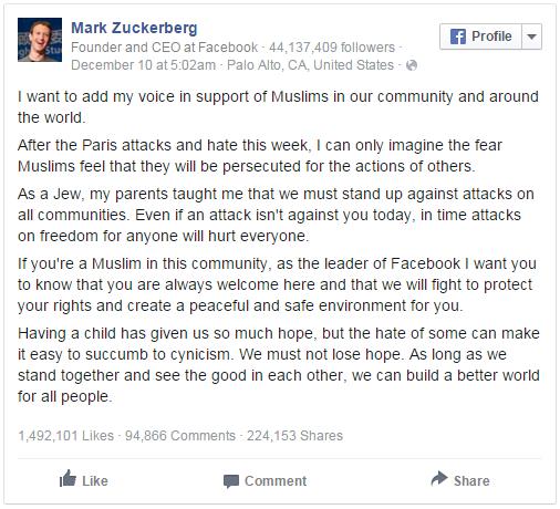 "Tôi muốn đóng góp thêm tiếng nói của mình để ủng hộ người Hồi giáo trong cộng đồng người dùng Facebook trên toàn thế giới. Sau các cuộc tấn công ở Paris, tôi chỉ có thể tưởng tượng được sự sợ hãi mà những người Hồi giáo đang cảm nhận, họ đang bị quy kết vì những hành động của những kẻ khác", Mark nói thêm.