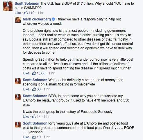 Ebola bùng phát tại Tây Phi đã làm ảnh hưởng tới ít nhất 8.000 người và giết chết hơn 4.000 người, trở thành một trong những thảm họa tồi tệ nhất trong lịch sử. Tổ chức Y tế thế giới (WHO) ước tính ít nhất phải chi 1 tỷ USD để chặn đứng Ebola, do đó khoản quyên góp của Zuckerberg có ý nghĩa cả về chất lẫn lượng.