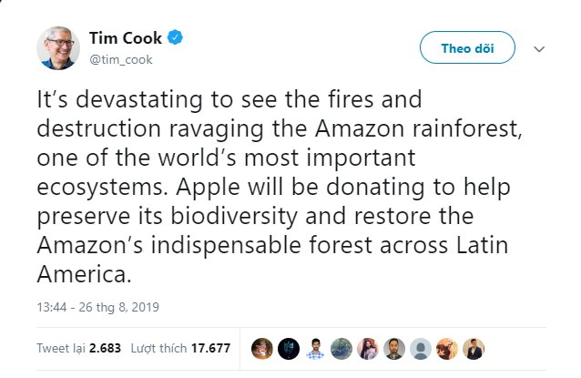 Apple cũng thông báo qua một tweet của CEO Tim Cook về việc quyên góp tiền ủng hộ cho công tác ứng cứu và khắc phục hậu quả của vụ cháy rừng nghiêm trọng ở rừng Amazon vừa qua.