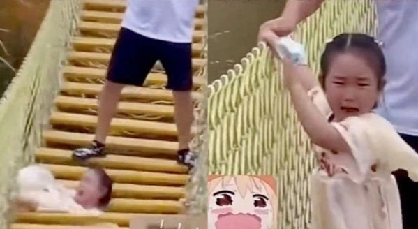Trong khi bé gái đang đứng bám vào thành cầu với biểu cảm lo sợ, không dám bước tiếp, người cha đứng ở gần đó và bắt đầu đung đưa cây cầu với nhịp mạnh. Phía trước, người mẹ dùng điện thoại quay lại cảnh tượng.