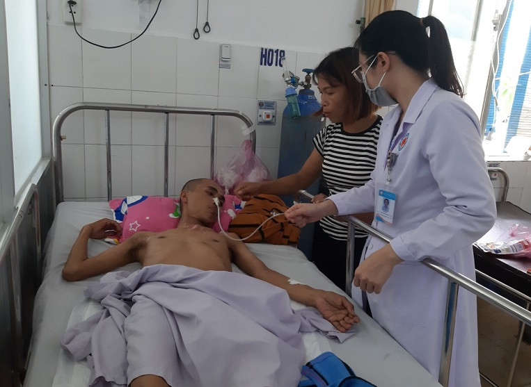 Tại bệnh viện Phục hồi chức năng – Điều trị bệnh nghề nghiệp, bác sĩ Đậu Thị Minh Phượng cho biết, anh Thân được chuyển tới trong tình trạng suy hô hấp, viêm phổi nặng, xuất huyết não, rách gan, gãy nhiều xương sườn. Sau gần một tháng điều trị tích cực, đến nay anh đã tỉnh, nhưng do thể trạng gầy yếu lại thêm đa chấn thương nên anh phục hồi khá chậm, phải nằm điều trị kéo dài.
