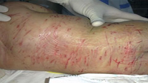 | Lưng của cháu bé bị chó cào xé nhiều vết rách |