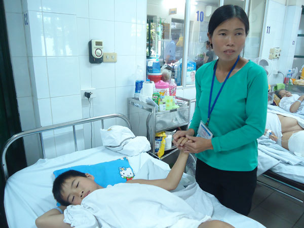 Vào thăm em Vi Xuân Huynh tại Khoa phẫu thuật chấn thương chỉnh hình 2, Bệnh viện Việt Đức, chúng tôi như chết lặng khi chứng kiến cảnh cậu bé đang rên rỉ đau đớn bởi những vết thương đang rướm máu trên khắp cơ thể, lại càng xót xa hơn khi bắt gặp ánh mắt thẫn thờ của người mẹ đang bón từng thìa cháo cho con với hai mắt sưng húp.