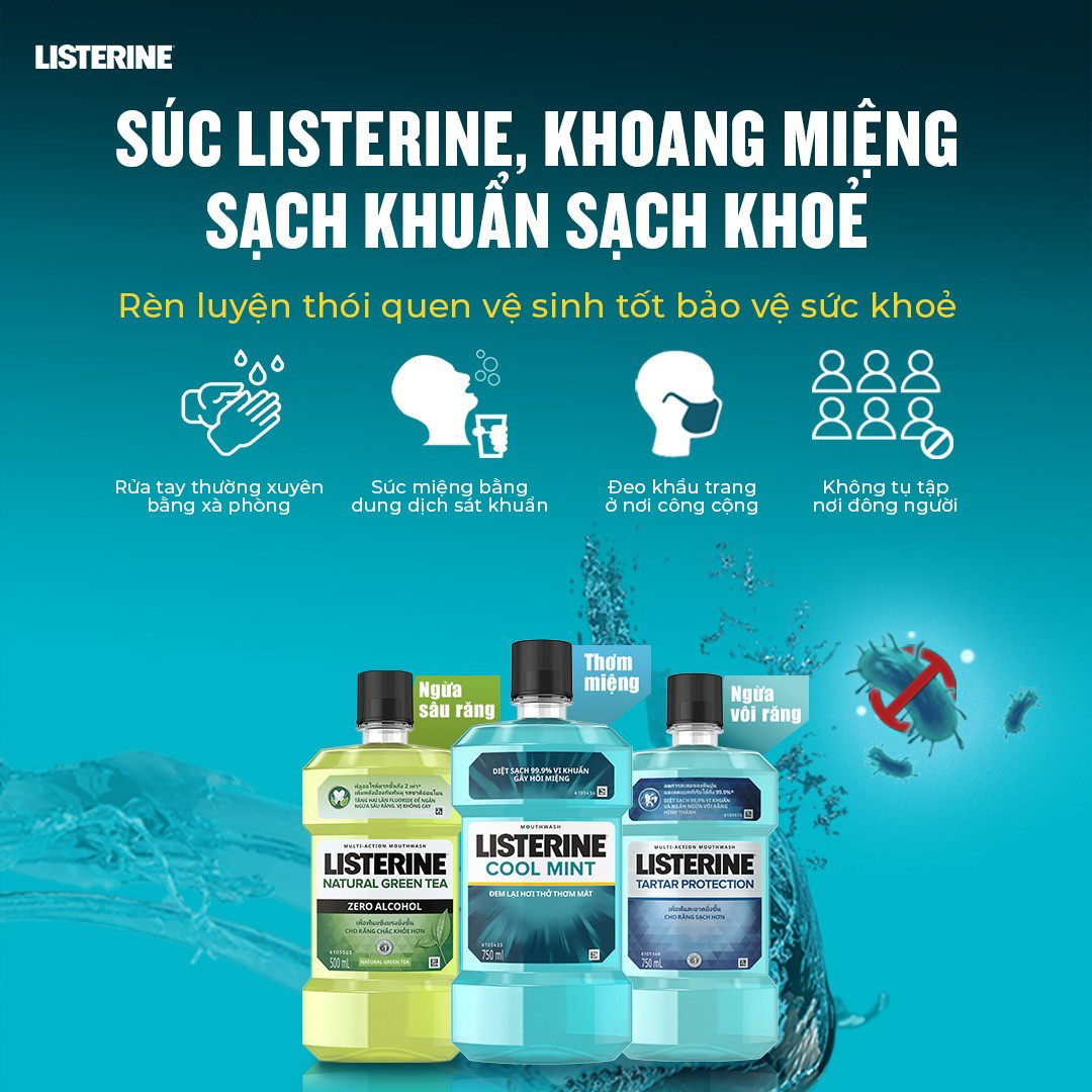 Bạn có thể lựa chọn những sản phẩm súc miệng diệt khuẩn có chứa hỗn hợp 4 tinh dầu từ thiên nhiên kết hợp cùng tinh chất trà xanh hoặc chanh muối như Listerine, vừa có tác dụng diệt khuẩn vừa mang lại hơi thở thơm mát. Với 30 giây súc miệng, mỗi ngày 2 lần sau khi đánh răng là có thể diệt đến 99,9% vi khuẩn, bảo vệ khoang miệng, răng, nướu, chống vi khuẩn suốt 24 giờ.