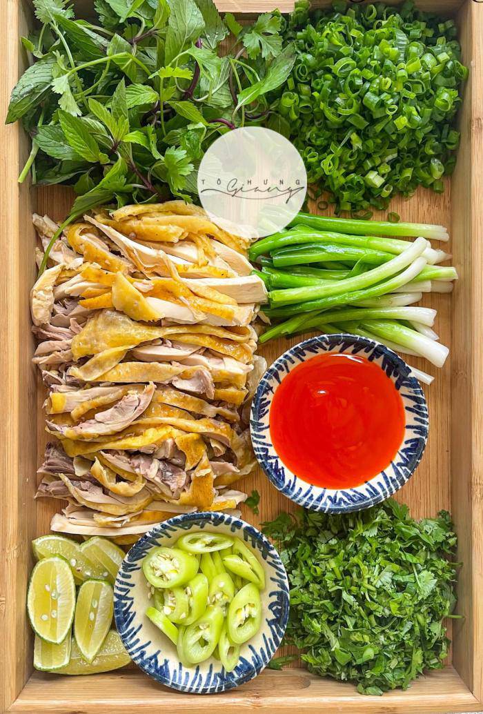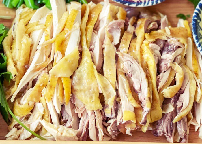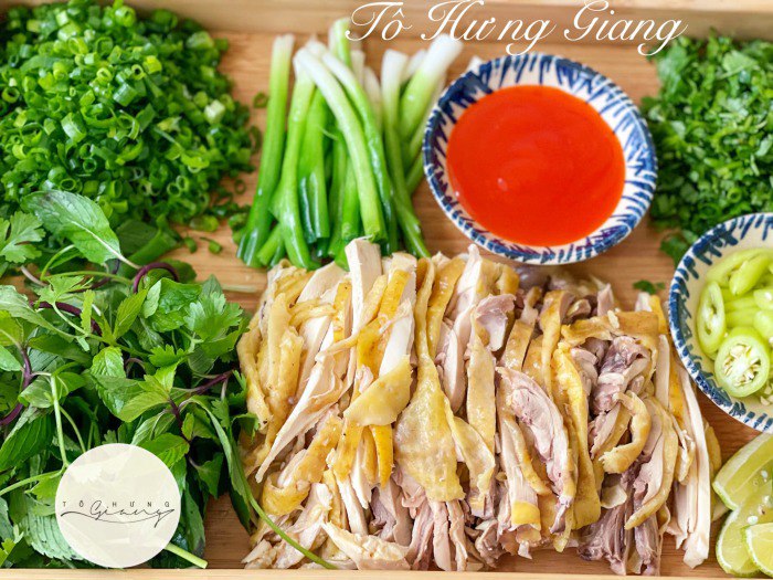 - Gà chín vớt gà ra, để nguội, lọc lấy phần thịt thái nhỏ hoặc xé nhỏ.