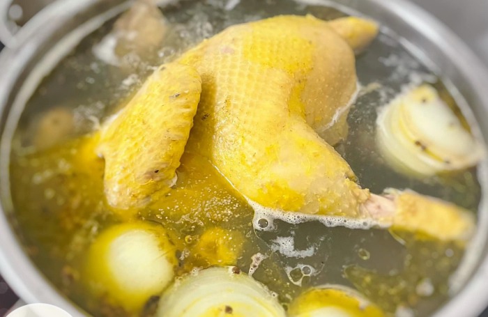 Phần xương gà tiếp tục cho vào nồi nước dùng ninh tiếp, trung bình từ lúc cho gà và các nguyên liệu khác vào nồi nấu khoảng 3 tiếng là có một nồi nước dùng ngon, ngọt, nếu có thời gian ninh càng lâu thì nước dùng càng ngọt.