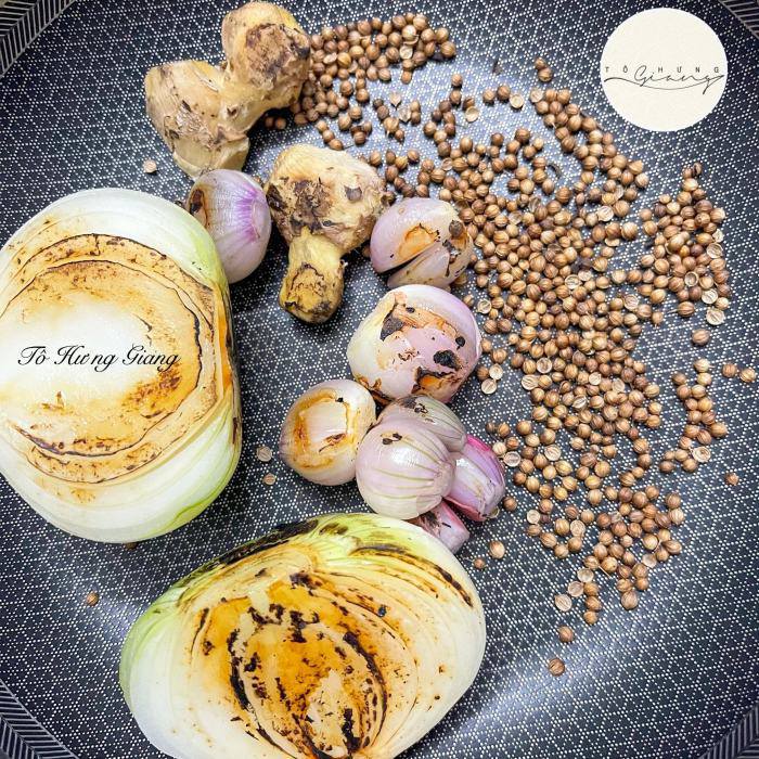 - Hành tây bổ làm đôi hoặc làm bốn, gừng, hành củ tím... nướng cho thơm.