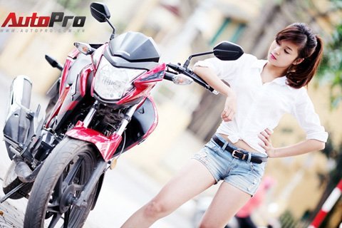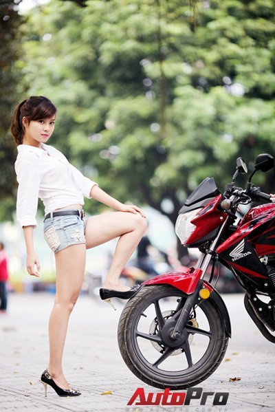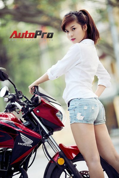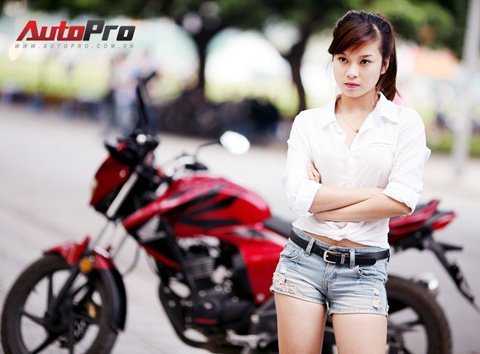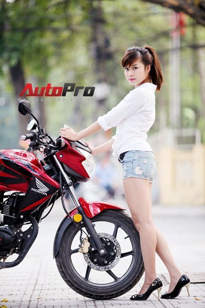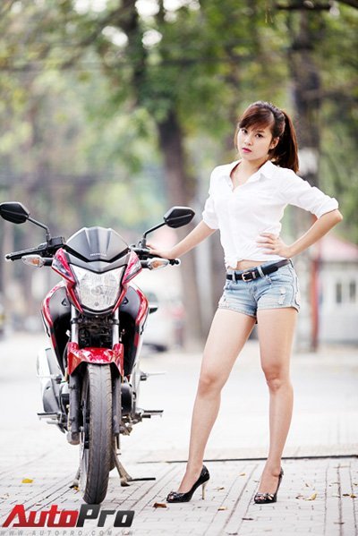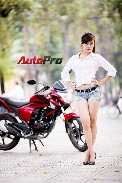 Cô nàng trong trang phục sơ mi trắng và quần short khoe dáng kiêu sa bên chiếc xe naked-bike Honda RR150.