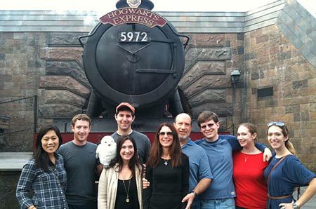 Zuckerberg và gia đình trong chuyến thăm Thế giới phù thủy của Harry Potter ở Orlando, nhân dịp Lễ Tạ ơn năm 2010.