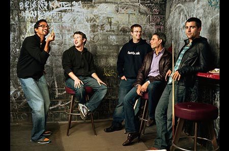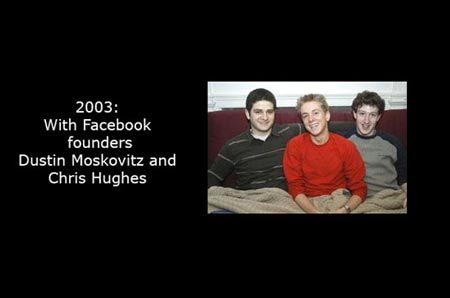 Zuckerberg ngồi cạnh những đồng sáng lập của Facebook. Câu chuyện về những ngày đầu thành lập công ty đã lên phim. “The Social Network” (tên bộ phim) đã xây dựng chân dung một thiên tài với những tính cách không mấy giống nguyên mẫu Zuckerberg.