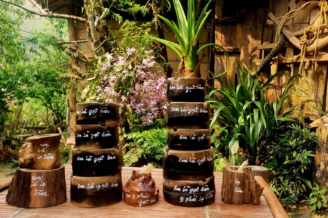 Vốn yêu thích nghệ thuật, A Chu dùng con mắt nghệ thuật của mình để tự làm những món đồ mỹ nghệ trang trí xinh xắn, bày biện khắp nơi trong nhà. Những mõ trâu, máng giã bánh dày hay cái chảo nhôm, nơm cá đều được tận dụng để trở thành chụp đèn, chậu rửa, vòi nước trong homestay…. Lọ tăm, thùng rác, nẹp gương nhà tắm, khung tranh đều được làm từ tre, gỗ. Những món đồ đó khiến du khách trong nước hay quốc tế đều cảm thấy thú vị, tò mò về nguồn gốc.