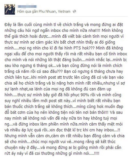 "Xin cảnh tỉnh các bạn. Mình thấy hơi buồn mà không nói không được, thà chịu mang tiếng xấu để mọi người không phải chịu cảm giác đau đớn, khó chịu, tủi nhục như mình. Những ai mới chích trắng xin hãy dừng lại đừng để lâu quá rồi phải hối hận nhé.