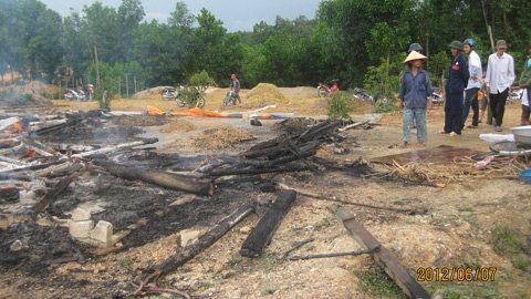 | Căn nhà gỗ của vợ chồng anh Tiến mới dựng để tránh lũ đã bị lửa thiêu rụi. Lúa mới thu hoạch được cũng cháy gần hết. |