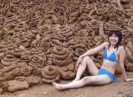 Cô gái mặc bikini vui tươi chụp ảnh bên các đống bùn hình cục phân.