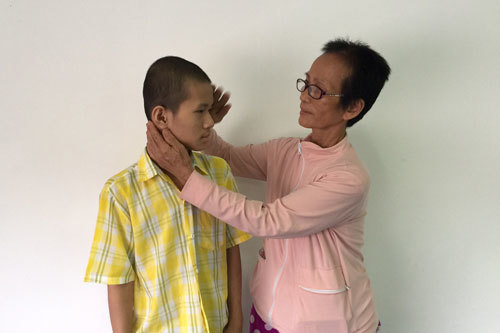 Ngày Thái Anh vào phòng mổ, bà nội cắt trọc đầu cầu mong sự bình an đến với cháu. Trải qua cuộc phẫu thuật lấy khối u trung thất ở BV Nhi Đồng 2, TP.HCM, em được chuyển đến BV Ung Bướu để điều trị hóa chất.