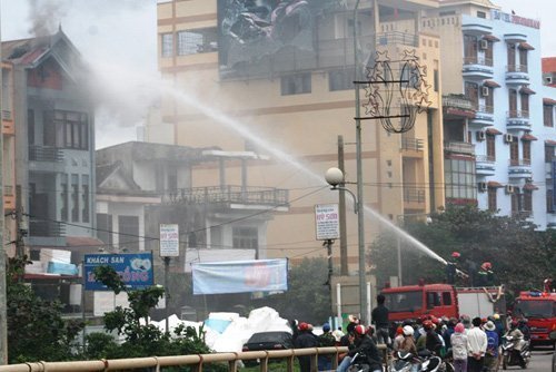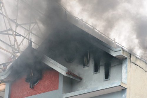 Tại hiện trường, ngọn lửa cùng khói đen bốc lên ngùn ngụt trên nóc căn nhà 4 tầng khiến hàng chục người náo loạn.