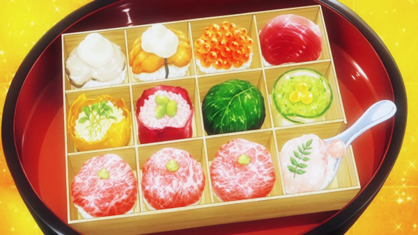 Vì vậy, quốc gia này còn có một lịch sử lâu đời về nghệ thuật trình bày món ăn. Người Nhật Bản dồn rất nhiều công phu vào việc bày biện trang trí sao cho thật cầu kỳ, đẹp mắt để bù lại sự giản dị về mặt hương vị. Sở dĩ, phim hoạt hình ẩm thực của Nhật dễ dàng phát triển hơn tại các quốc gia khá vì đơn giản đối với người Nhật, đôi khi "ăn bằng mắt" cũng đủ thấy no rồi.
