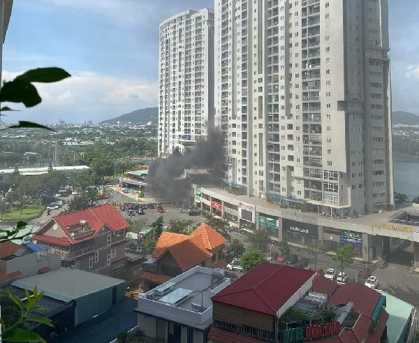 Cột khói đen bốc lên từ quán Ocean Beer cạnh chung cư. Ảnh: CTV