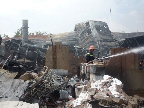 Theo ghi nhận tại hiện trường, bên trong cơ sở, nhiều phuy hóa chất nằm lăn lóc trên mặt đất, bốc mùi nồng nặc. Nhiều thiết bị máy móc, nguyên liệu, vật tư, thành phẩm chỉ còn lại đống tro tàn. Một số nhà dân kế cận bị cháy, thiệt hại đáng kể về tài sản…