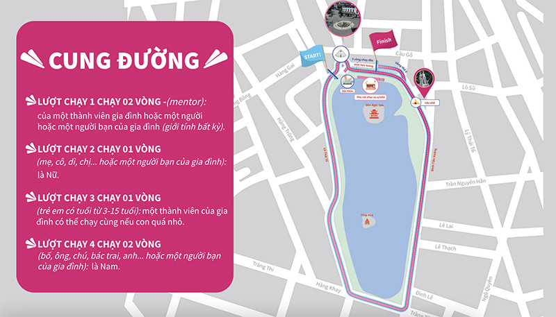 Về cách thức tham gia, mỗi đội chạy cần có 4 thành viên bắt buộc để tạo thành một Happy Team hay Biệt đội hạnh phúc. Trong đó yêu cầu có 1 thành viên đóng vai trò Mentor (giới tính bất kỳ) chịu trách nhiệm chạy lượt đầu tiên 2 vòng. Lượt tiếp theo sẽ là một thành viên nữ chạy tiếp 1 vòng. Tiếp tục đến lượt thứ 3, một bạn nhỏ (độ tuổi từ 3 đến 15 tuổi) chạy tiếp 1 vòng và ở lượt cuối cùng thành viên nam còn lại sẽ chạy 2 vòng. Tất cả cùng chinh phục quãng đường có tổng chiều dài 10km tại bờ hồ Hoàn Kiếm, Hà Nội.