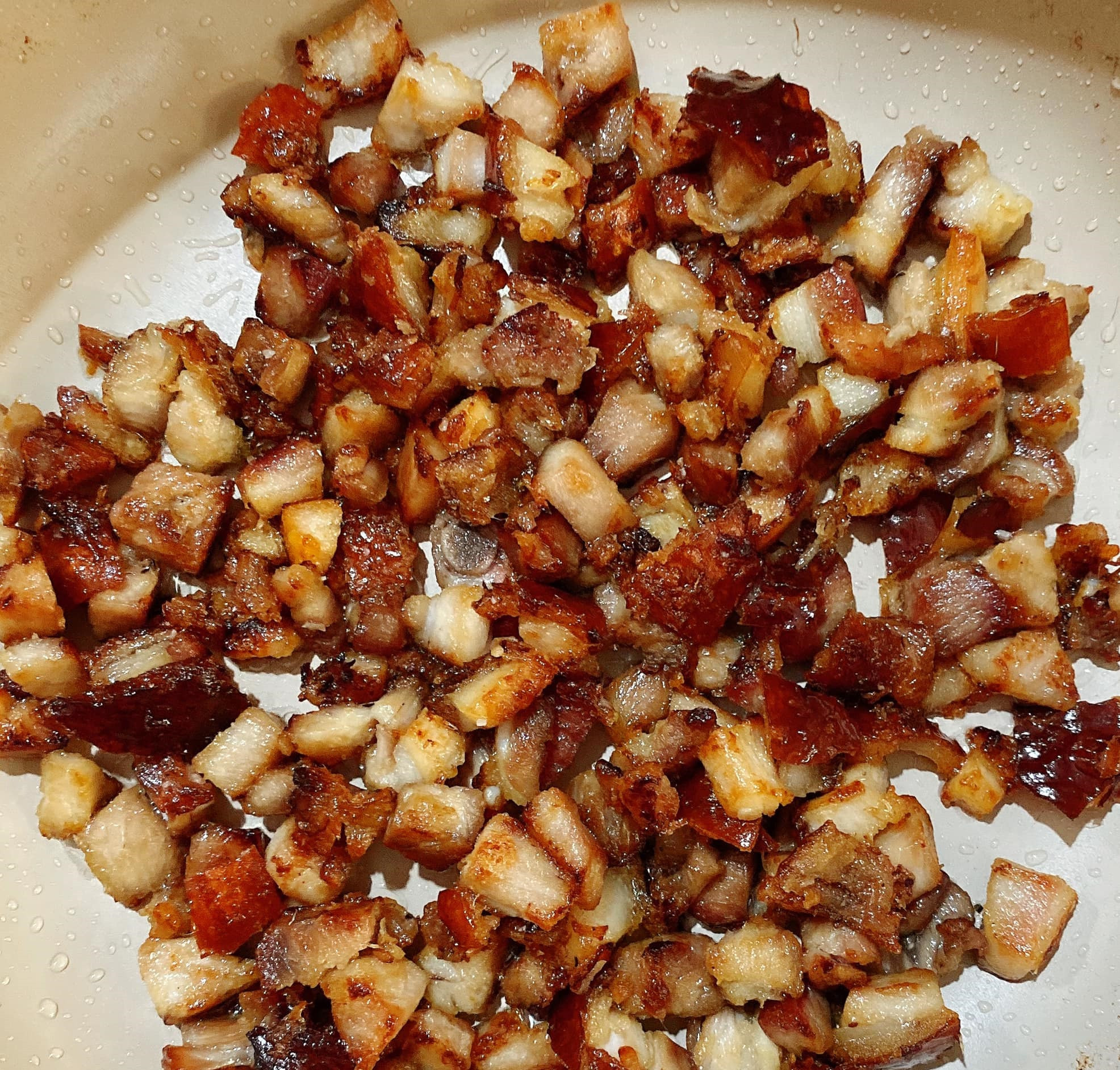 Đầu tiên, thịt heo phải chọn miếng ba chỉ, có chút mỡ pha với nạc để phần nhân khi chế biến sẽ có độ mềm, béo ngậy và không bị quá khô. Thịt được sơ chế sạch, đem quay hoặc chiên cho giòn bì, sau đó thái thành các miếng vuông vắn, lớn hơn hạt lựu một chút.