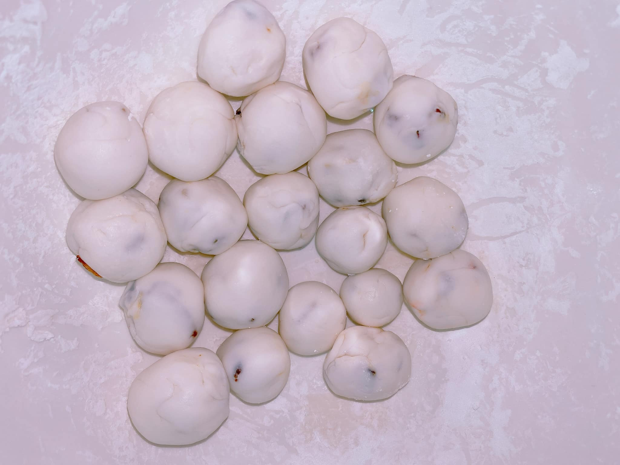 Sau đó, ngắt bột đã nhào thành các phần nhỏ để chuẩn bị bọc nhân thịt quay. Đặt miếng thịt vào giữa miếng bột lọc, viên thành hình tròn sao cho lớp vỏ bọc kín phần nhân, không bị bục hay rách. Công đoạn này cũng cần thực hiện đều tay để không làm hở miếng thịt.