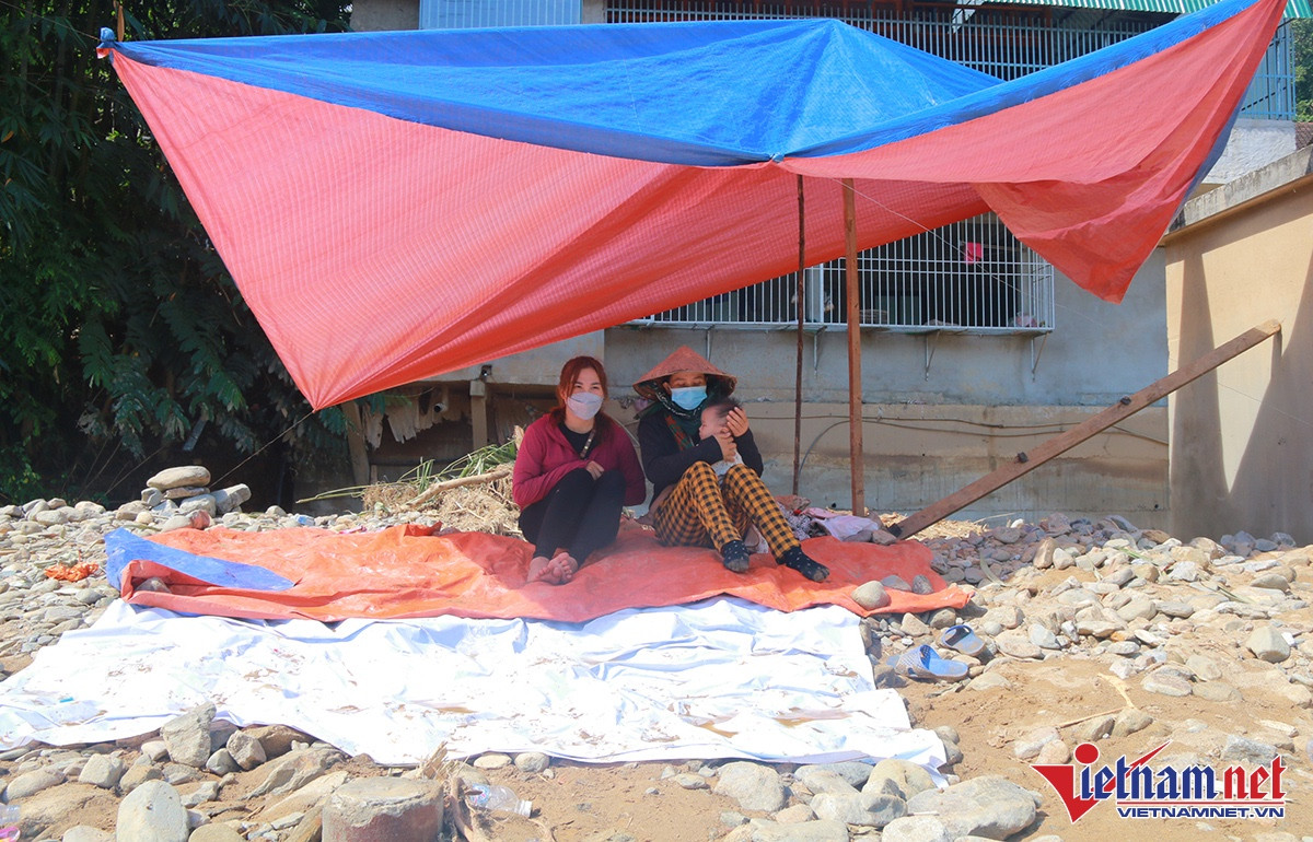 Khi nắng đã lên, mưa ngừng rơi, không thể ở nhờ mãi nhà hàng xóm hay người quen, một số người dân đã mua tạm vài tấm bạt, lấy khúc gỗ ở đâu đó trôi về dựng lều tạm để ở ngay trên nền nhà cũ. Đó là trường hợp vợ chồng chị Nguyễn Thị Hoàng Yến (SN 1993), bản Hoà Sơn, xã Tà Cạ, huyện Kỳ Sơn, Nghệ An cùng con gái Tuệ Nhi (vừa sinh nhật 1 tuổi vào tối hôm qua 5/10) ngồi dưới tấm bạt chăng tạm. Đứa trẻ vẫn say sưa ngủ trên tay một người quen đang hỏi thăm tình hình.
