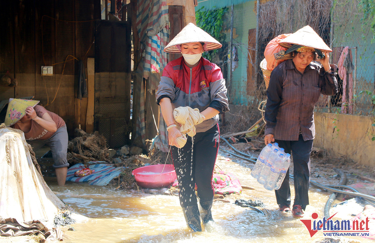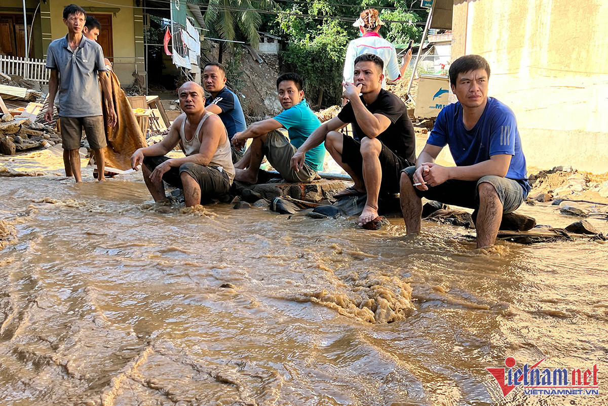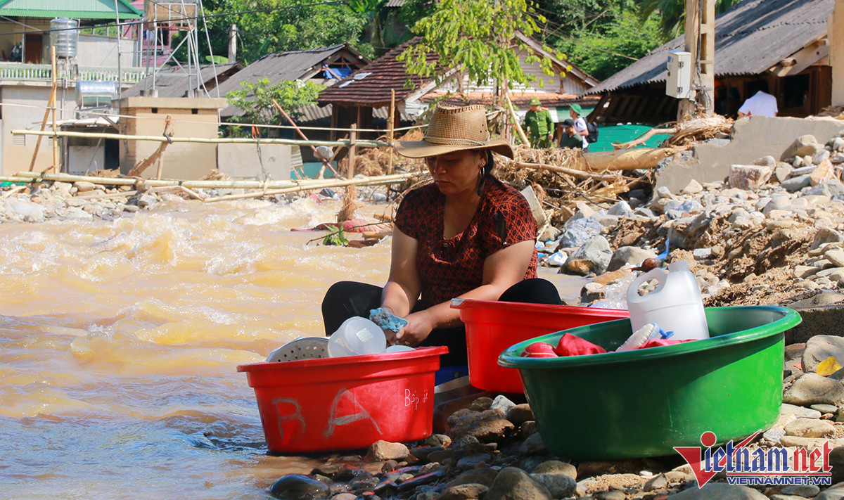 Rũ bùn dưới dòng nước sau lũ quét lịch sử - Ảnh: Trần Tuyên