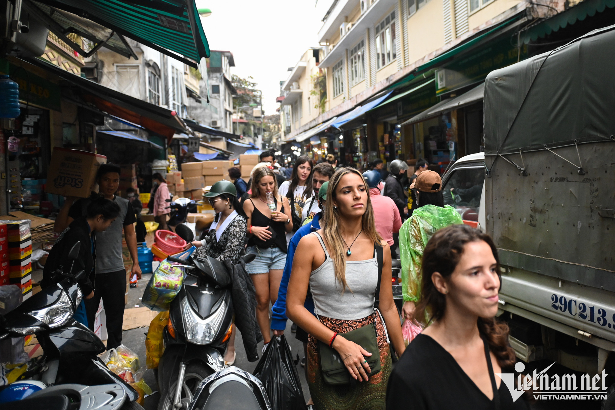 Nhân dịp này, nhiều du khách quốc tế tranh thủ dạo chơi ở các tuyến phố kinh doanh sầm uất để tìm hiểu không khí Tết của Hà Nội. Các phương tiện và người đi bộ chen lấn giữa lòng đường, còn hàng hóa của các cửa hàng đã được bày chiếm hết không gian vỉa hè.