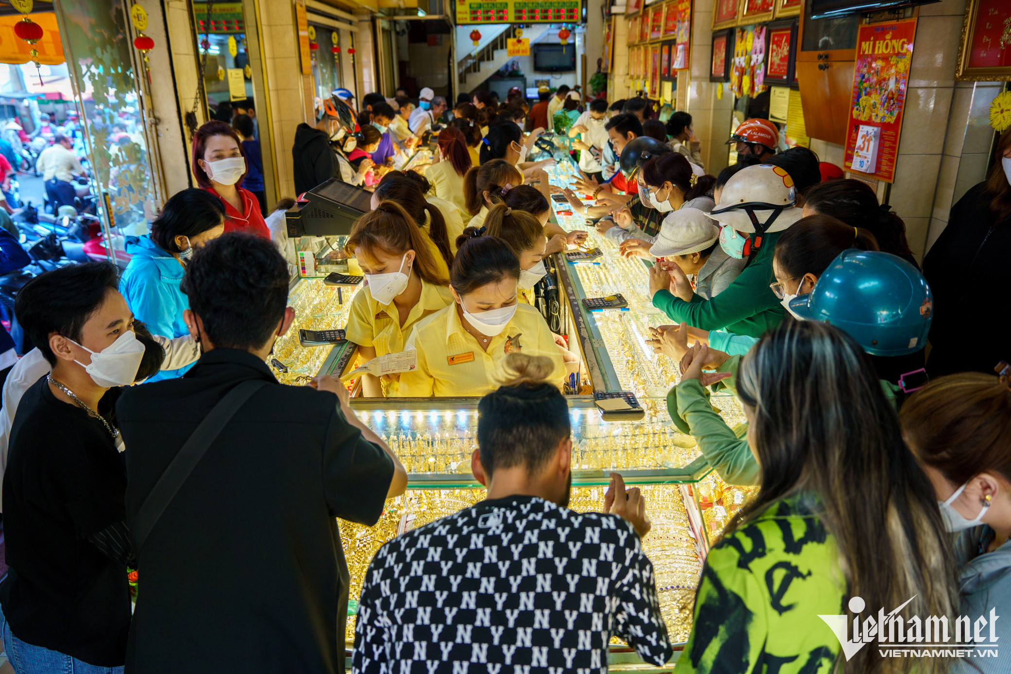 Tiệm vàng Mi Hồng (Bình Thạnh), một trong những điểm mua bán vàng nhộn nhịp bậc nhất TP.HCM sáng 31/1. Khách đứng kín lối đi nhưng nhờ nhân viên cửa hàng chủ động điều phối nên không xảy ra tình trạng chen lấn.