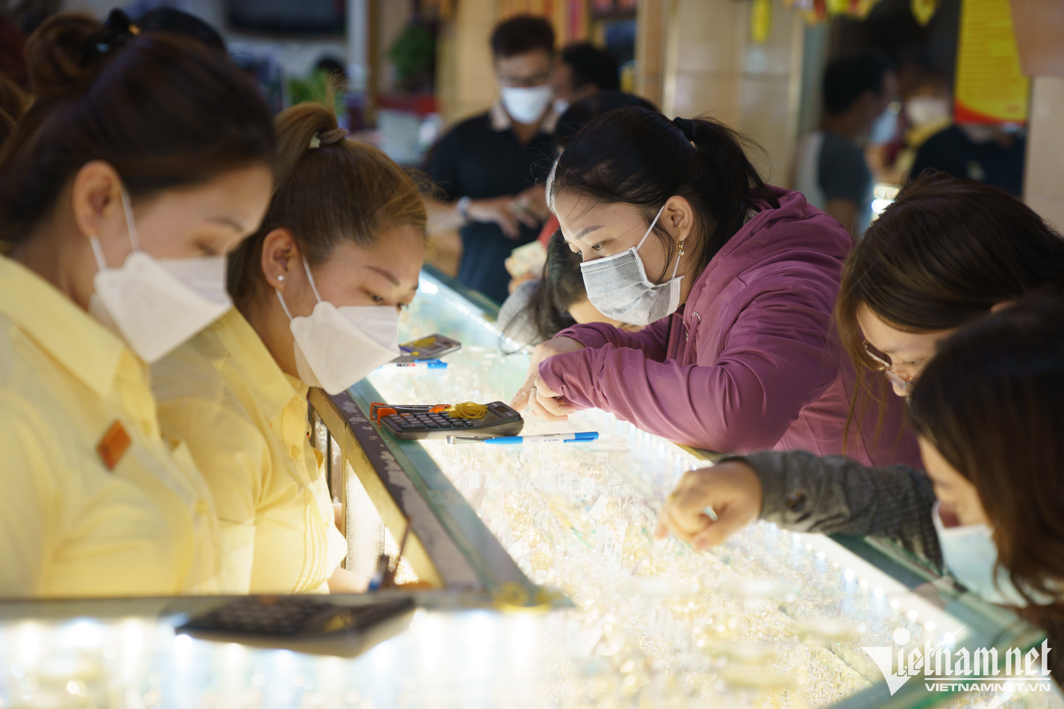 Nhóm bạn của chị Nguyễn Thị Sang (32 tuổi) cho biết, từ sáng sớm đã tranh thủ đi mua vàng cầu may. Năm nay, chị chọn mua miếng vàng nhẫn để giảm thiểu lỗ, với mong muốn làm ăn phát lộc, phát tài trong năm mới.