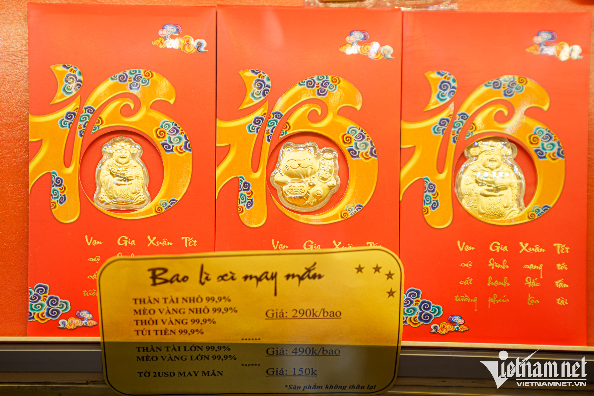 Khác với những năm trước, mẫu mã sản phẩm vàng theo bộ sưu tập ngày Thần Tài năm nay khá hạn chế. Thay vào đó, khách hàng có thể tập trung mua các sản phẩm bao lì xì có miếng vàng hình mèo và thần với nhiều kích thước lựa chọn.