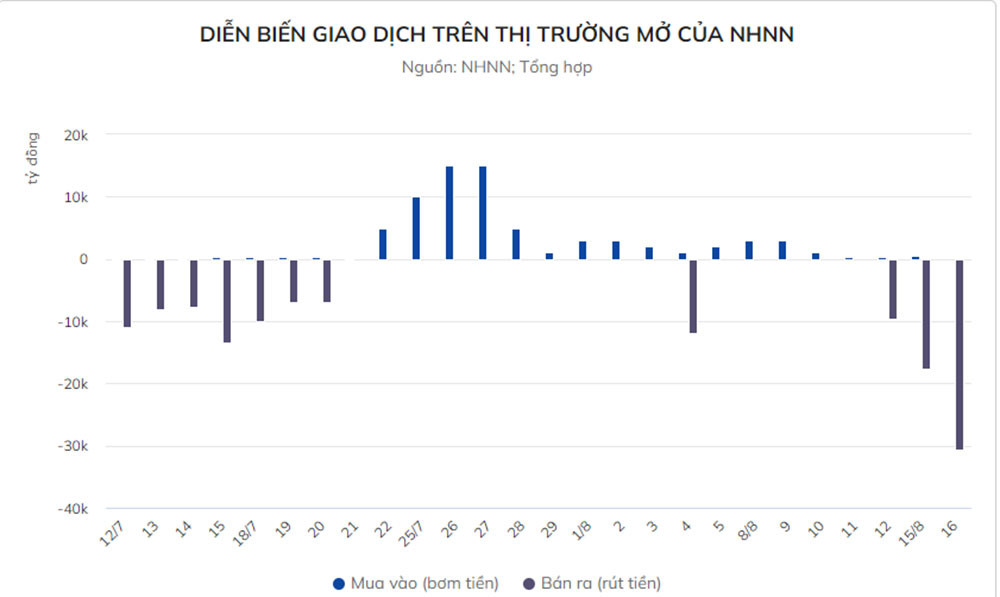 Trong phiên gần nhất (16/8), NHNN đã dừng hẳn giao dịch mua tín phiếu, thay vào đó là giao dịch bán gần 20.000 tỷ đồng tín phiếu kỳ hạn 7 ngày và 10.600 tỷ đồng kỳ hạn 14 ngày. Tổng cộng, NHNN đã rút ròng gần 30.600 tỷ đồng ra khỏi thị trường trong ngày hôm qua.