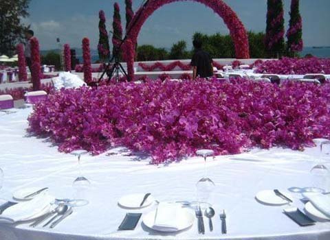 Hôn trường được trang trí cầu kỳ với hàng ngàn bông hoa tươi.