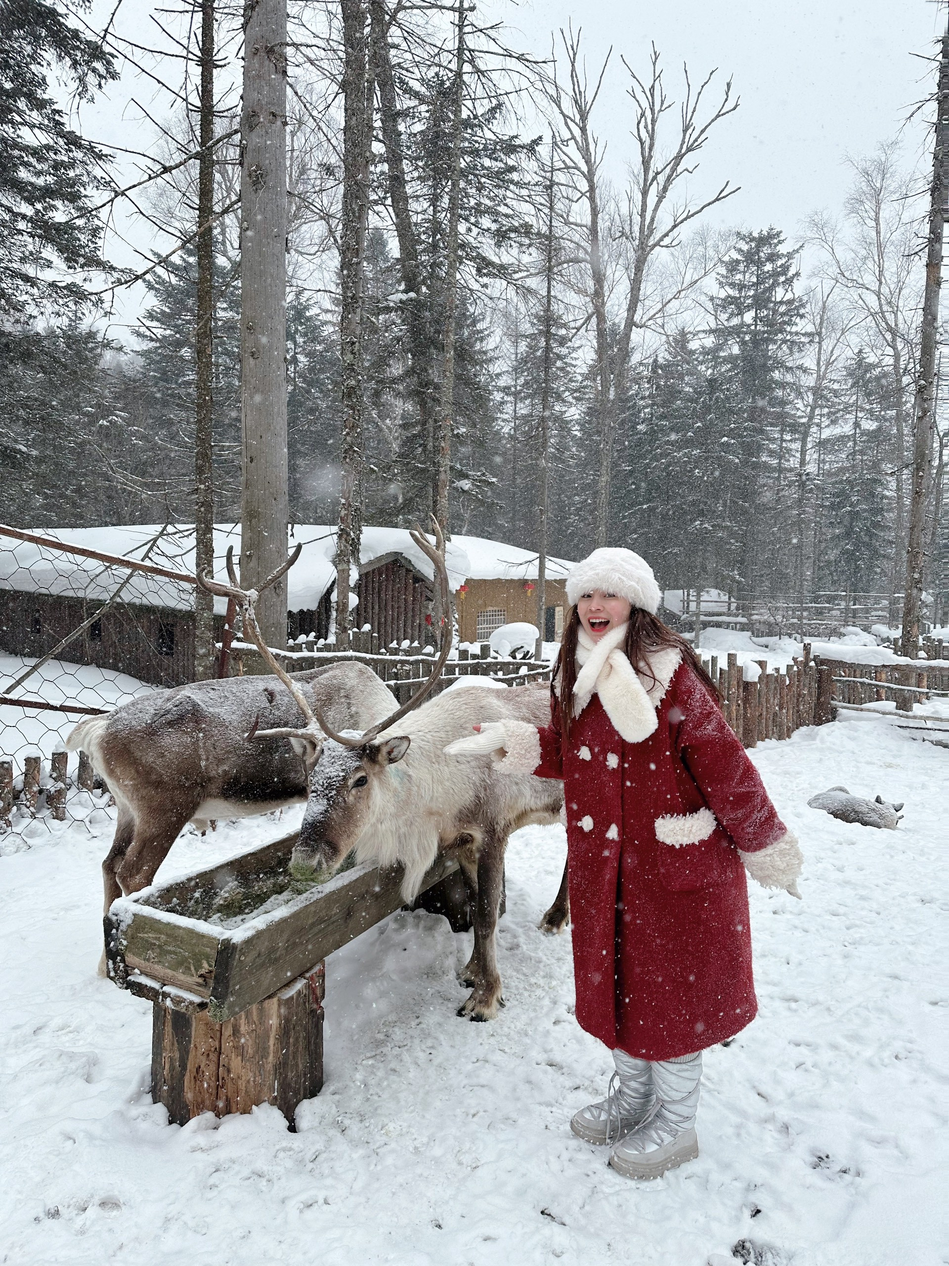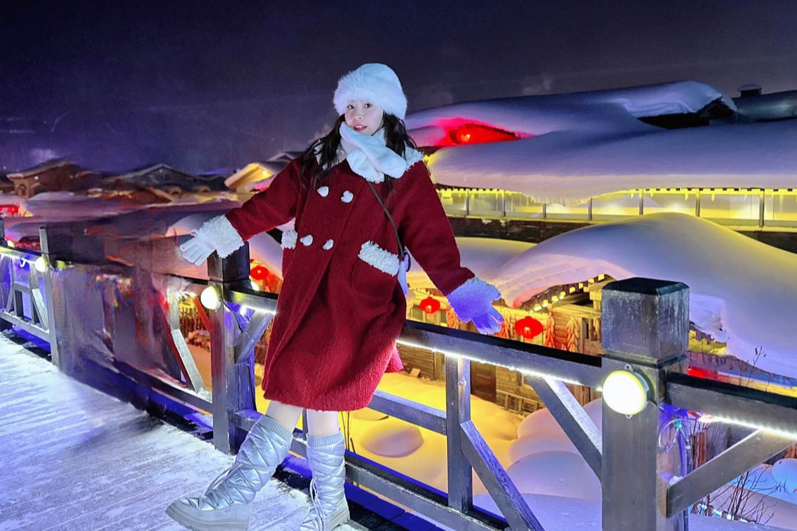 Trong chuyến đi, chị Trang cũng ghé thăm làng tuyết Tuyết Hương, ngôi làng với những mái nhà phủ kín tuyết trắng như cổ tích. Ngôi làng nằm cách trung tâm thành phố Cáp Nhĩ Tân khoảng gần 300km về phía Đông Nam Trung Quốc, thuộc thành phố Mẫu Đơn Giang, tỉnh Hắc Long Giang.