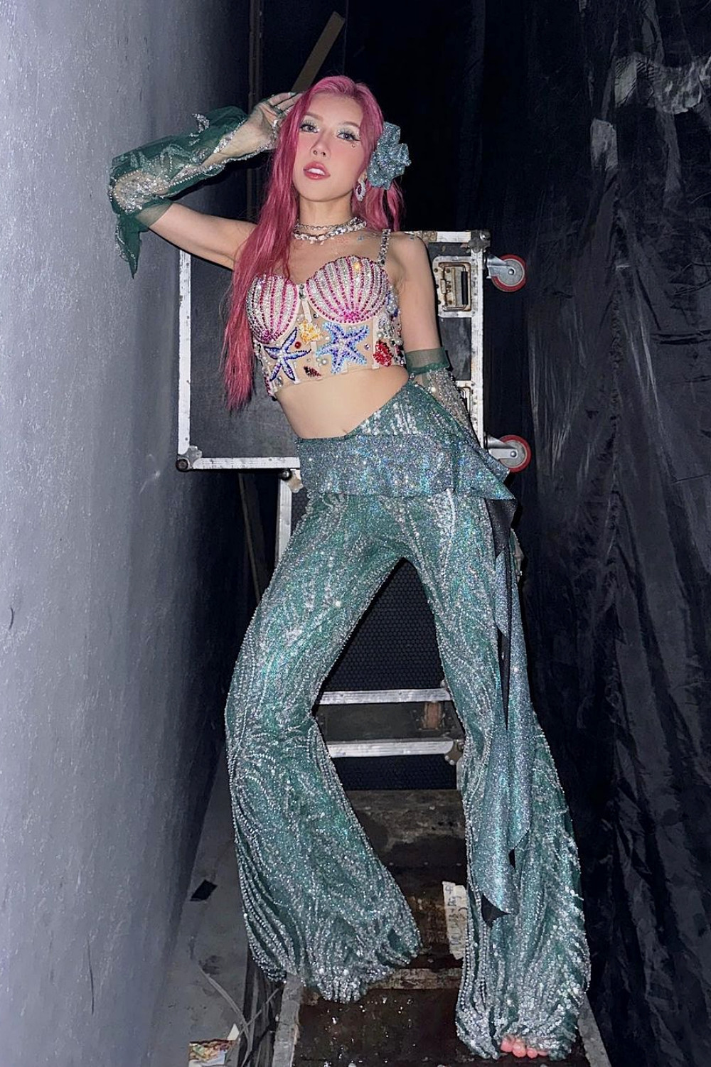 Ở ngoài đời, với thời trang đi biển, nữ ca sĩ cũng yêu thích những màu sắc sáng màu, nổi bật, sặc sỡ. Để luôn làm mới bản thân, cô thay đổi luân phiên giữa bikini cổ yếm 2 mảnh, áo tắm 1 mảnh xẻ sâu tới tận rốn, áo 2 dây dạng ren.
