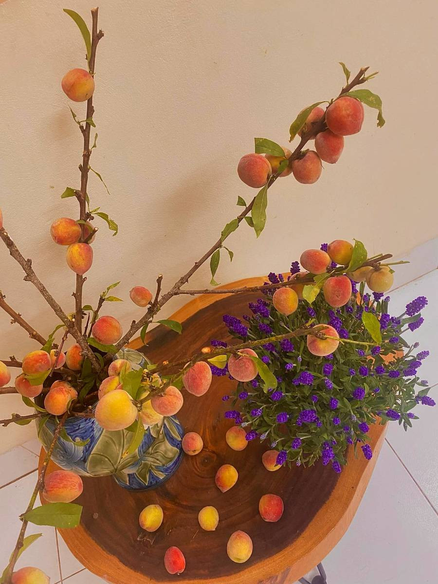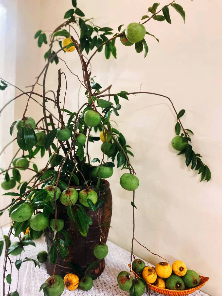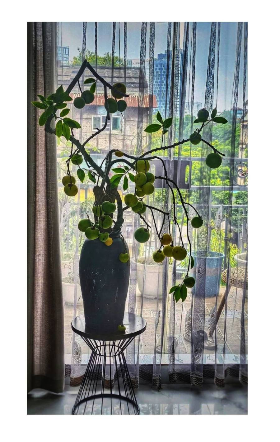 Điều thú vị là các loại cành quả thường giữ được độ tươi khá lâu. Để chúng bền đẹp, chị thường dùng mẹo nhỏ, cứa nhẹ phần thân cành trước khi cắm để giúp chúng hút nước tốt hơn, giữ được độ tươi lâu cùng mùi hương đặc trưng.