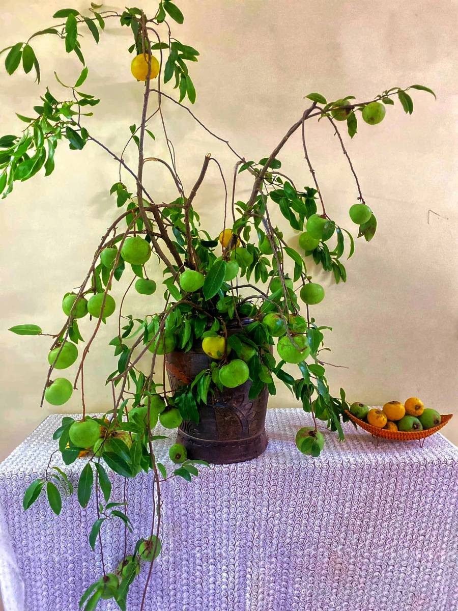 "Cành thị mua về, tuốt bớt lá để nhìn rõ được quả thị, cắm vào bình hay chum miệng rộng vừa phải để cành thị được cố định, không xoay trái hay xoay phải.