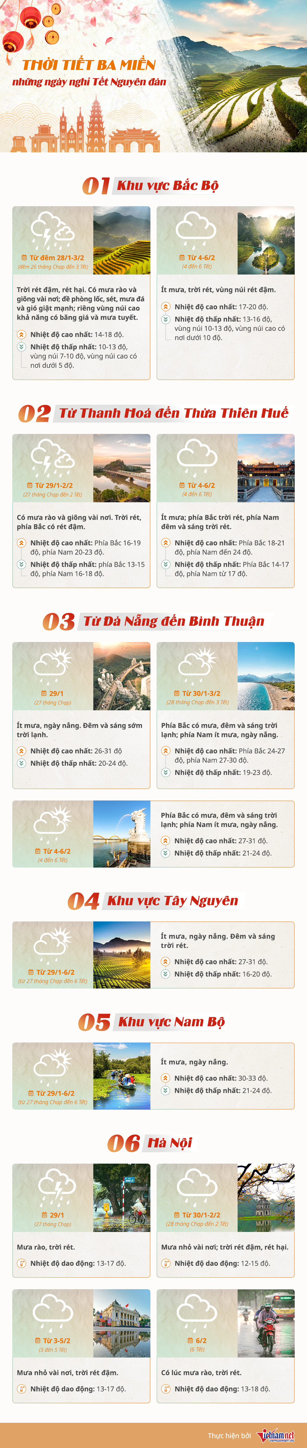 Từ ngày 29/1 (tức 27 tháng Chạp), Bắc Bộ và Bắc Trung Bộ có rét đậm, rét hại và kéo dài liên tục trong những ngày Tết, vùng núi cao có khả năng xảy ra mưa tuyết và băng giá.