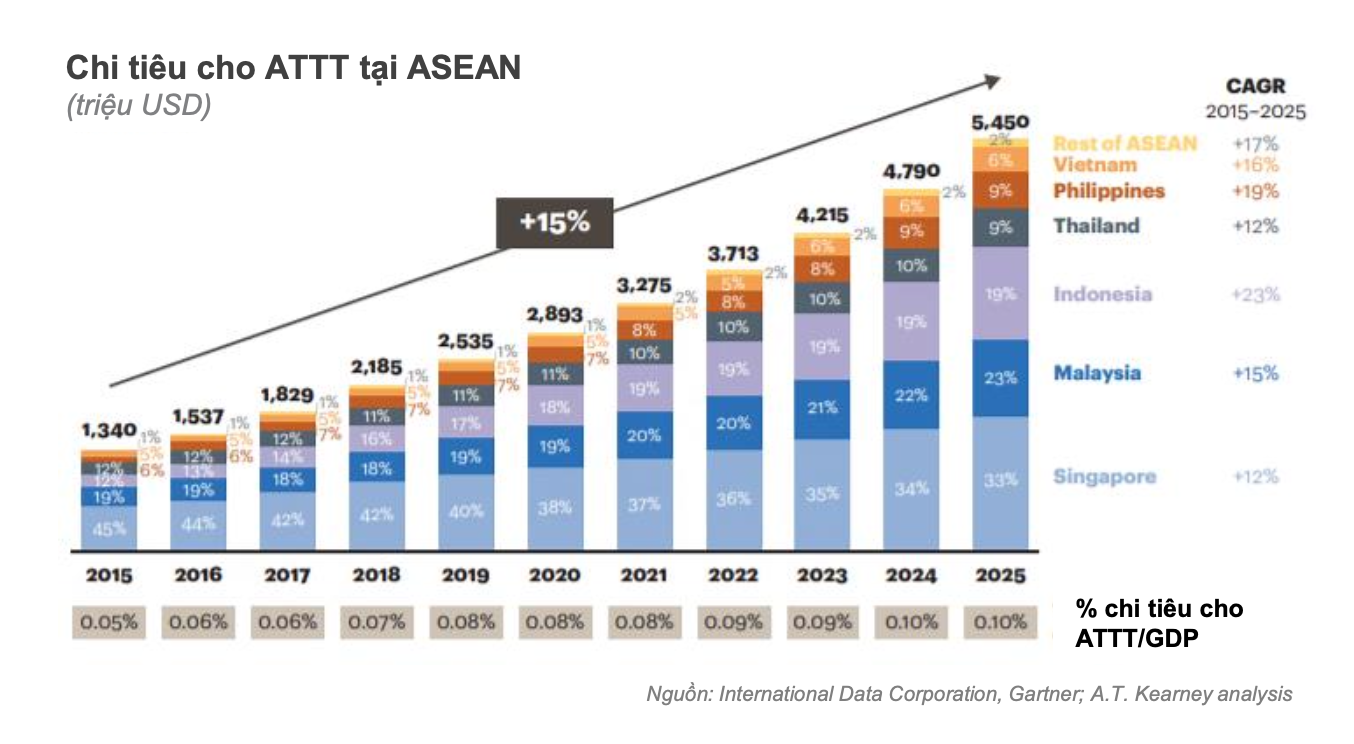 Trong khu vực Đông Nam Á, các quốc gia dẫn đầu về chi tiêu cho ATTT là Singapore, Malaysia, Indonesia (chiếm gần 75% thị trường). Việt Nam là 1 trong 3 quốc gia có tốc độ tăng trưởng nhanh nhất dành cho chi tiêu ATTT, bên cạnh Philippines và Indonesia.