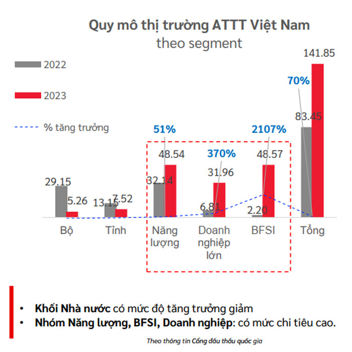 Ngoài ra, nhóm năng lượng, ngân hàng - tài chính - chứng khoán, doanh nghiệp lớn đang là những nhóm ngành có mức chi tiêu cao nhất cho ATTT. Cụ thể so với năm 2022, nhóm năng lượng, doanh nghiệp lớn, BFSI có mức tăng trưởng về chi tiêu vượt bậc lần lượt là 51%, 370% và 2107%.