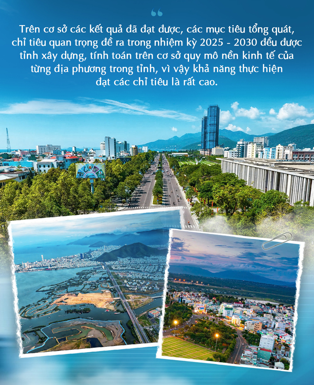 Trong đó, phấn đấu tốc độ tăng tổng sản phẩm địa phương (GRDP) giai đoạn 2025 - 2030 đạt 10% - 10,5%/năm (giá so sánh 2010). GRDP bình quân đầu người đạt 6.300 - 6.500 USD. Cơ cấu kinh tế đến năm 2030: Ngành nông, lâm nghiệp, thủy sản chiếm 19,5 - 20%; công nghiệp - xây dựng chiếm 36 - 36,5%; dịch vụ chiếm 40 - 41%; thuế sản phẩm trừ trợ cấp sản phẩm chiếm 4,2%. Đến năm 2030, tổng thu ngân sách trên địa bàn tỉnh đạt trên 41.000 tỷ đồng. Tổng kim ngạch xuất khẩu giai đoạn 2026 - 2030 đạt trên 17 tỷ USD. Huy động vốn đầu tư phát triển toàn xã hội đến cuối năm 2030 đạt 32,2%/GRDP. Phấn đấu đón 18,5 triệu lượt khách du lịch; trong đó có 1,1 triệu lượt khách quốc tế.