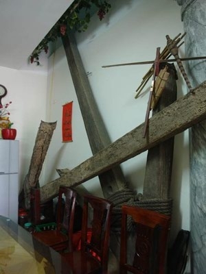 Vì nhà chật chội, và hai chiếc mỏ neo quá lớn, ông Địch phải "ghé" nó sát mé tường - Ảnh: Kiên Trung