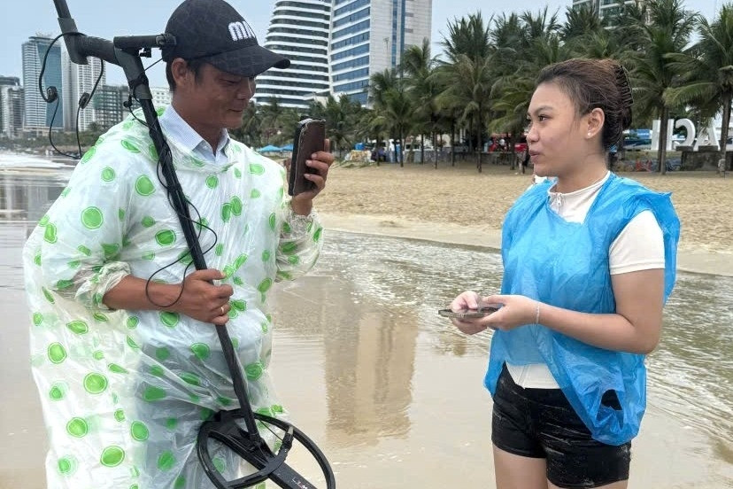Sáng 1/8, ngoài giờ làm việc, 2 anh mang theo thiết bị dò kim loại chuyên dụng đến khu vực bãi tắm Cửa Đại. Dưới thời tiết nắng nóng, sau nỗ lực dò tìm, cuối cùng họ cũng phát hiện chiếc nhẫn nằm dưới lớp cát, sát mép nước.