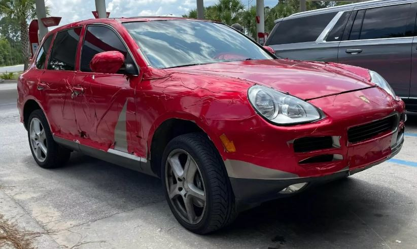 Có thể thấy, màu sơn bạc nguyên bản của chiếc Porsche Cayenne thế hệ đầu này được che phủ một phần bởi những mảng nhựa vinyl lớn màu đỏ đã bị nhàu nát và cắt xén lung tung. Điểm trông dễ coi nhất là nắp ca-pô ở tình trạng tốt hơn nhiều so với những bộ phận khác như cản trước, cửa và mui xe...