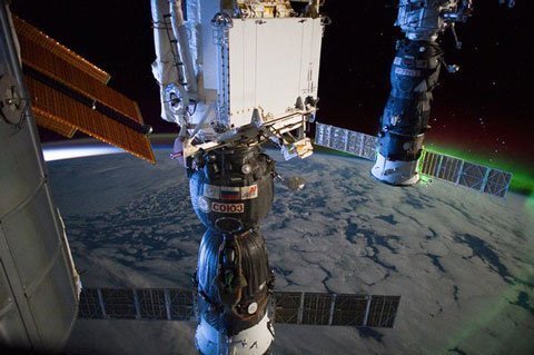 Từ vị trí thuận lợi ở phía trên cao, cách xa Trái đất hồi tháng 3, các phi hành gia trên trạm vũ trụ quốc tế (ISS) đã chụp được ảnh các cực quang lúc tảng sáng (trái) và ban đêm trong cùng một khung hình. Được chụp ở phía trên Ấn Độ Dương, bức ảnh cũng cho thấy tàu vũ trụ Soyuz và một tàu tiếp tế Progress của Nga đang neo đậu tại trạm ISS.