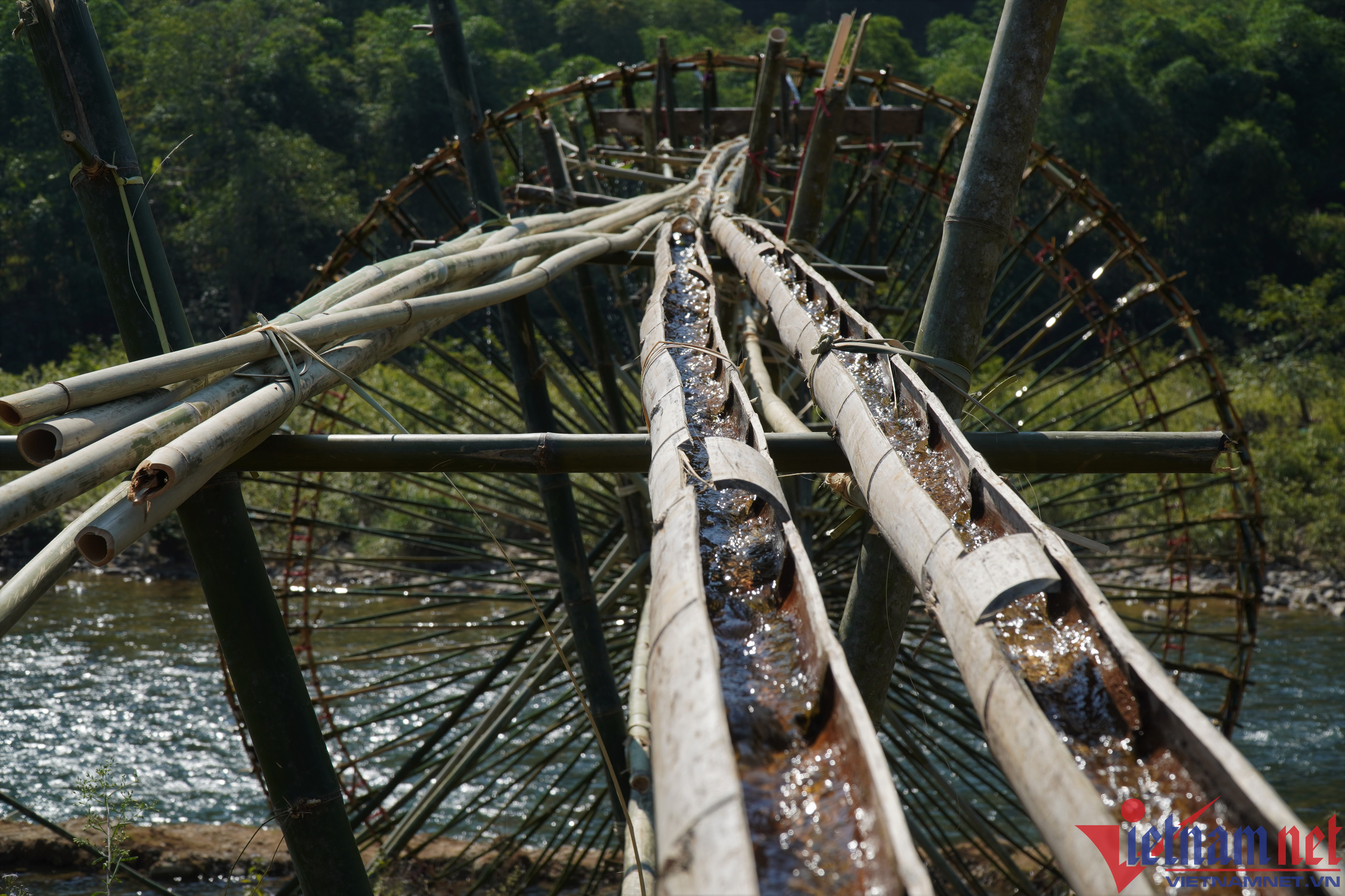 Những ngày này, bà con dân tộc ở các huyện vùng cao Thanh Hóa như: Bá Thước, Quan Sơn, Quan Hóa… đang tất bật lấy nước vào đồng ruộng để làm đất chuẩn bị cho đợt gieo cấy.Những guồng nước, hay còn gọi là những “cỗ máy” khổng lồ được vận hành bằng cách lợi dụng sức chảy của dòng nước để quay tròn, lấy nước vào máng đưa lên cao, dẫn vào ruộng lúa.Ông Hà Văn Mun (60 tuổi), trú bản Bách, xã Trung Thượng, huyện Quan Sơn cho biết, người dân địa phương không biết rõ guồng nước có từ bao giờ. Chỉ biết rằng, guồng nước này đã được cha ông sáng tạo ra, được các thế hệ gìn giữ và bảo tồn cho đến ngày nay.Guồng nước được làm hoàn toàn thủ công, tận dụng những vật liệu có sẵn từ tự nhiên của núi rừng như cây tre, cây vầu (hoặc cây đền), nứa.Trục quay là yếu tố quyết định thành bại của guồng nước. Trục quay không chuẩn thì vòng quay sẽ bị kẹt và không thể lấy nước lên được. Do đó người dân sử dụng nguyên liệu làm trục phải chọn những cây gỗ thẳng, vừa nhẹ, vừa mềm lại không bị mài mòn và phải có khả năng chịu nước cao.Khi guồng quay, ống đựng nước sẽ được nhấn sâu xuống suối để múc nước.Guồng quay nâng ống nước lên cao, ống nước tự động đổ nước vào máng để đưa nước vào đồng ruộng.Máng dùng để đưa nước vào đồng ruộng.Sau khi có nước vào ruộng, người dân bắt đầu làm đất để chuẩn bị cho đợt gieo cấy.