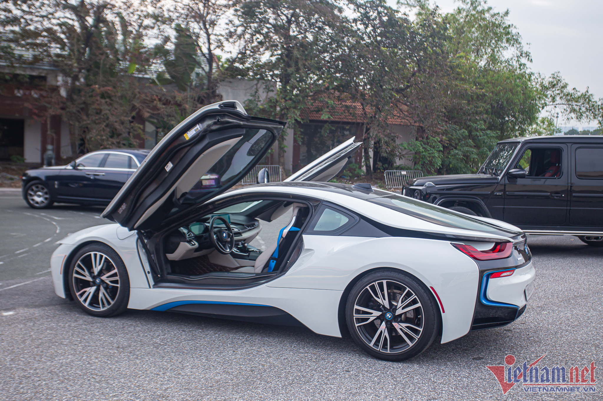 BMW i8 – một mẫu xe thể thao từng được nhiều dân chơi Việt ưa chuộng với ngoại thất phối hai màu trắng và xanh.